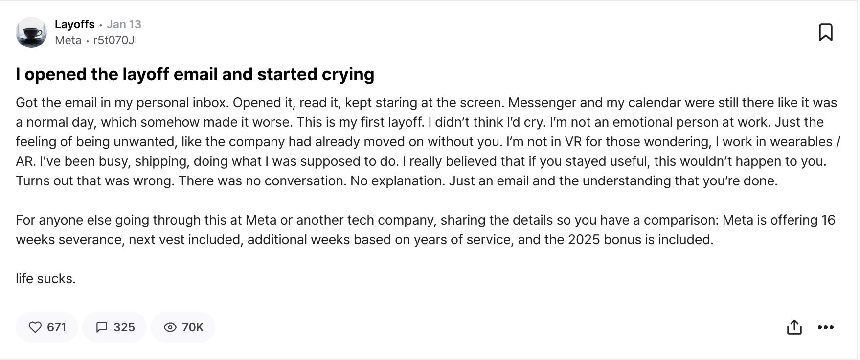 An employee claiming to work for Meta, who said was recently laid off, shared their distress on the anonymous tech‑worker forum Blind: