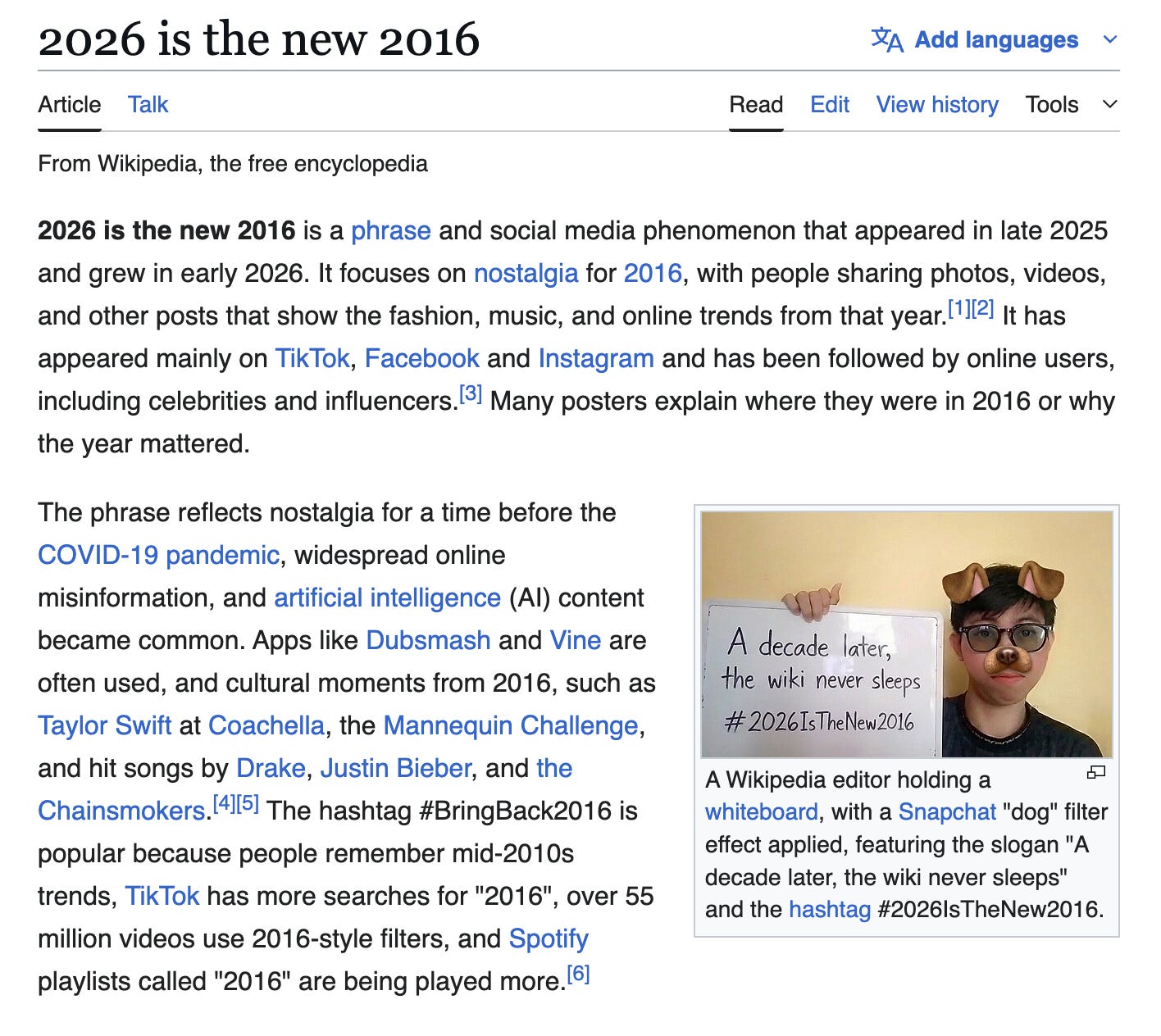 The first weeks of 2026 saw a viral trend emerge, celebrating 2016 as a seemingly simpler, more optimistic time. The #2016 trend dominated social media platforms like Instagram and TikTok with visual hallmarks of a bygone era: old, cringey Snapchat puppy filter selfies, and overly saturated Starbucks posts took over the internet as users declared, “2026 is the new 2016.” The BBC reported that searches for “2016” on TikTok increased sharply in the first weeks of 2026, and over 55 million videos were created using 2016-style filters like Instagram’s Rio De Janeiro.
