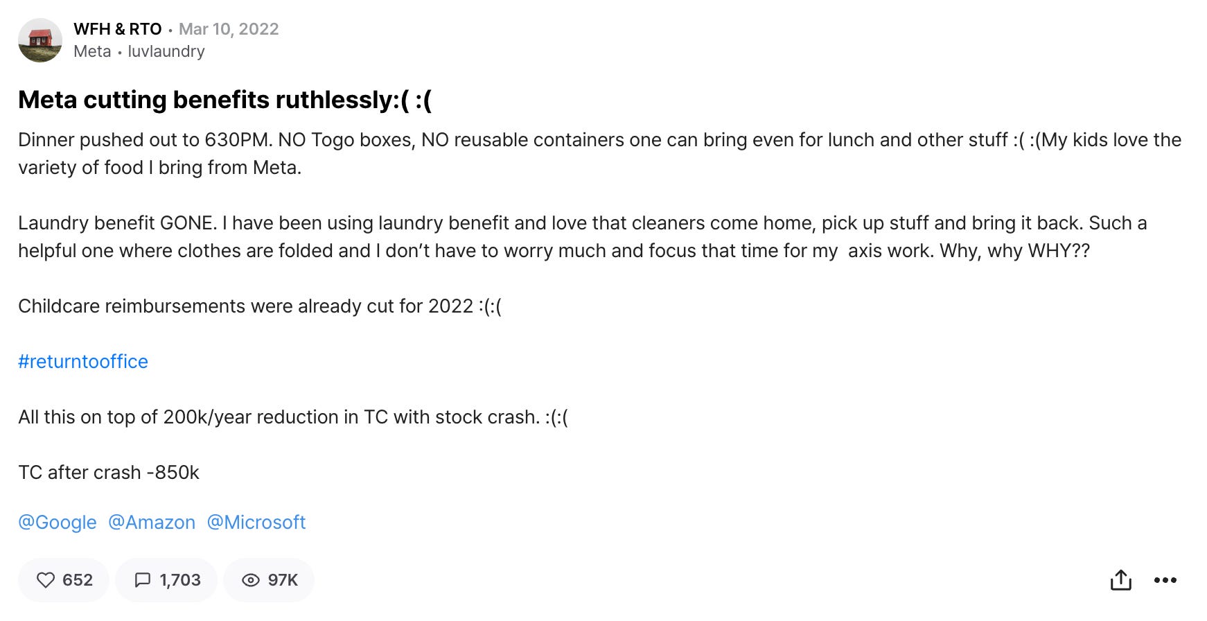 Here’s a complaint from an anonymous blind user about Meta reportedly removing the laundry perk, from someone also claiming to work at Meta: